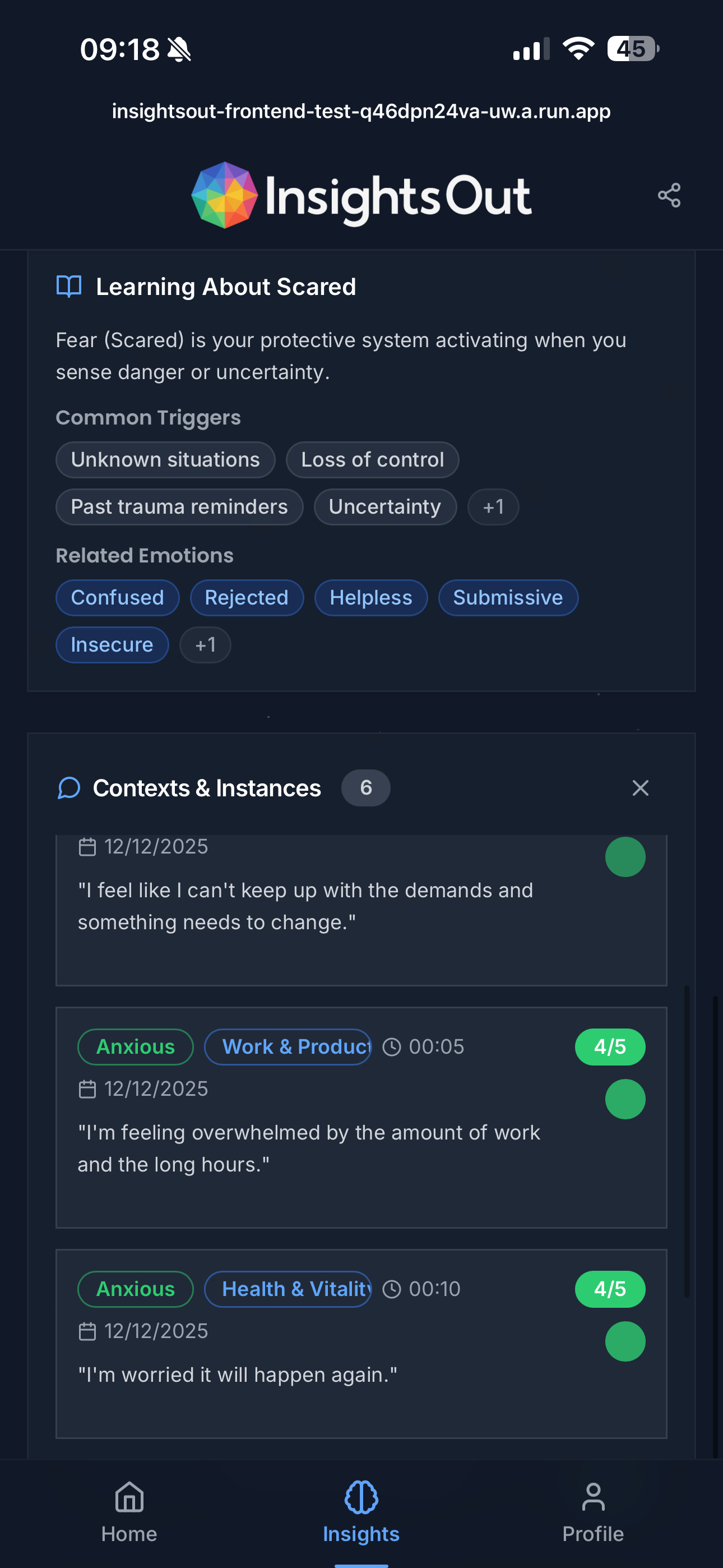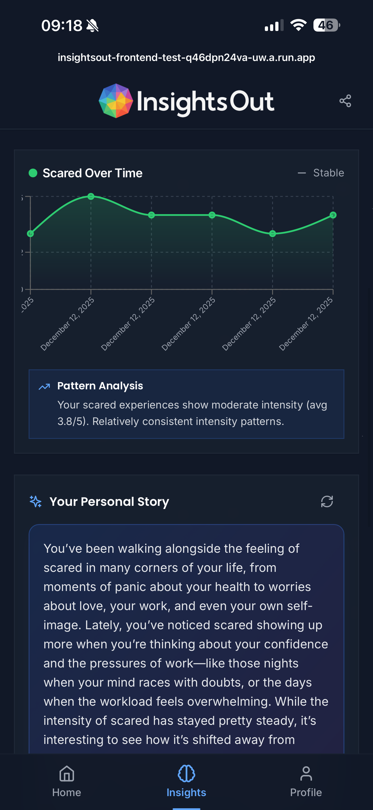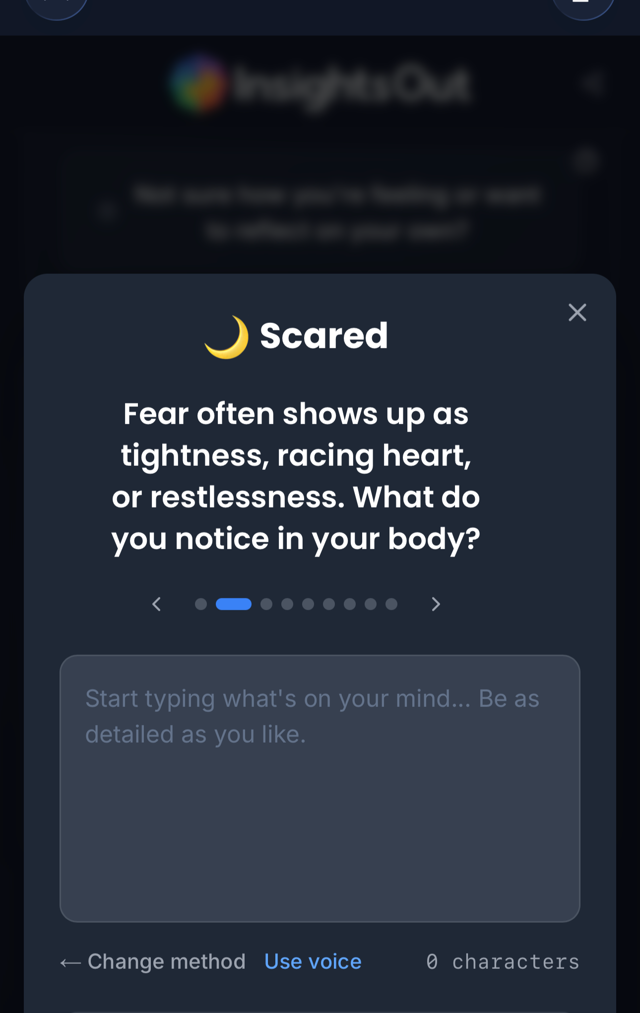 InsightsOut helps you understand your emotions and what they’re trying to tell you. Over time, you start to notice what keeps coming up and what helps things move.